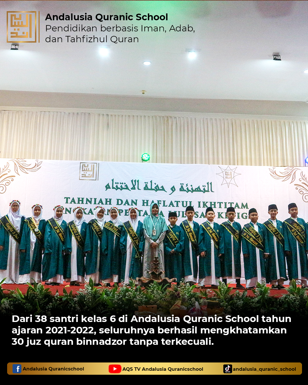 Dari 38 santri kelas 6 di Andalusia Quranic School tahun ajaran 2021-2022, seluruhnya berhasil mengkhatamkan 30 juz quran binnadzor tanpa terkecuali.
